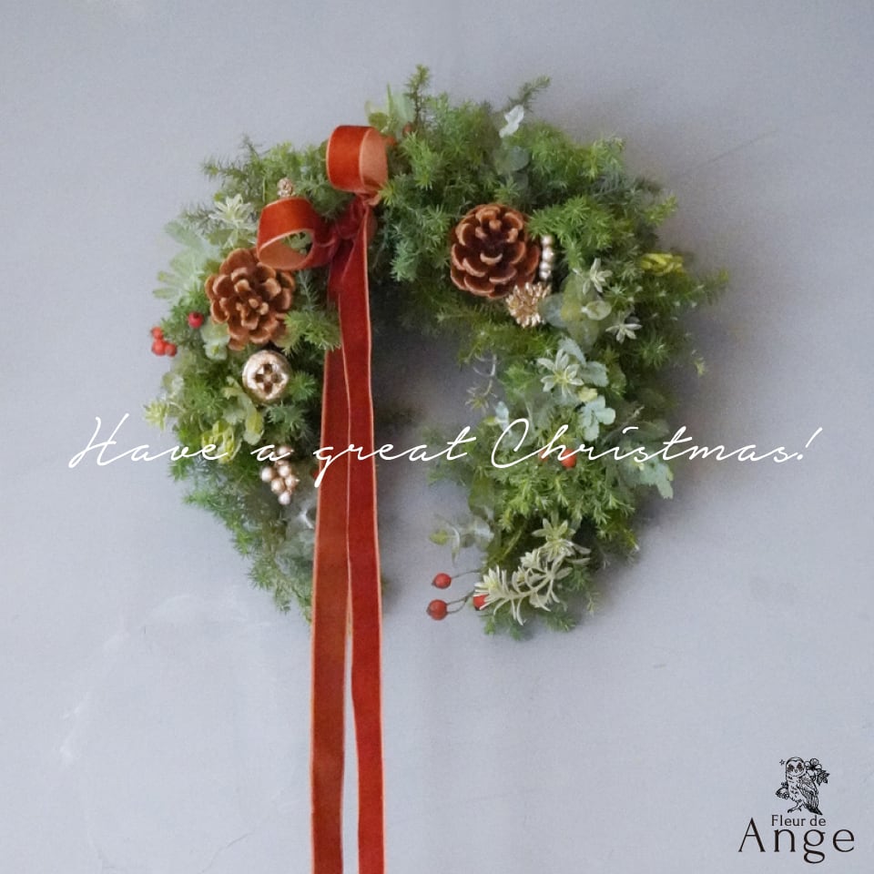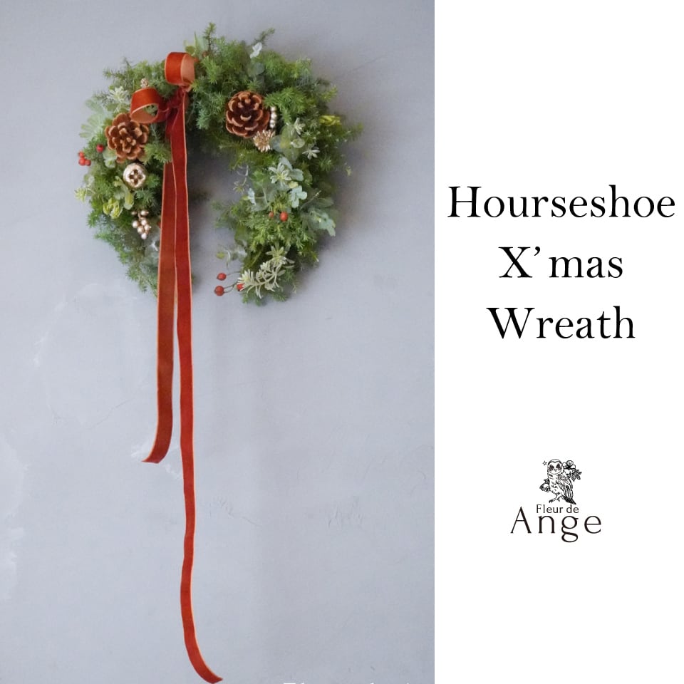 ヒムロスギを使用したグリーンいっぱいの馬蹄型のクリスマスリース。