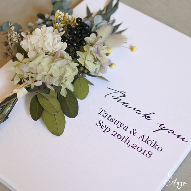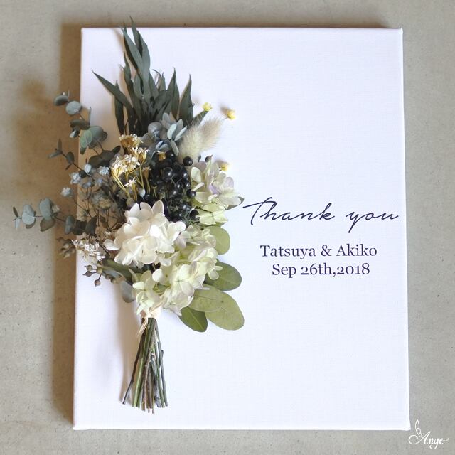 プリザーブドフラワーとドライフラワーのスワッグ付キャンバスボードです。