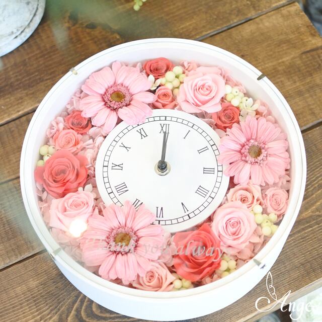 おもわず、可愛い!といった言葉が、こぼれそうなプリザーブドフラワーの花時計のアレンジ。
