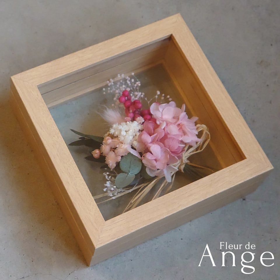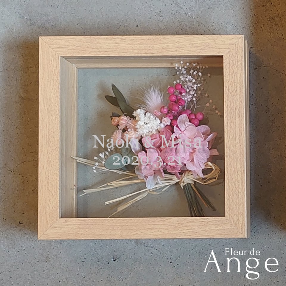 両面ガラスのフレームにプリザーブドフラワーを中心にしたミニブーケをお入れしたアレンジメント。